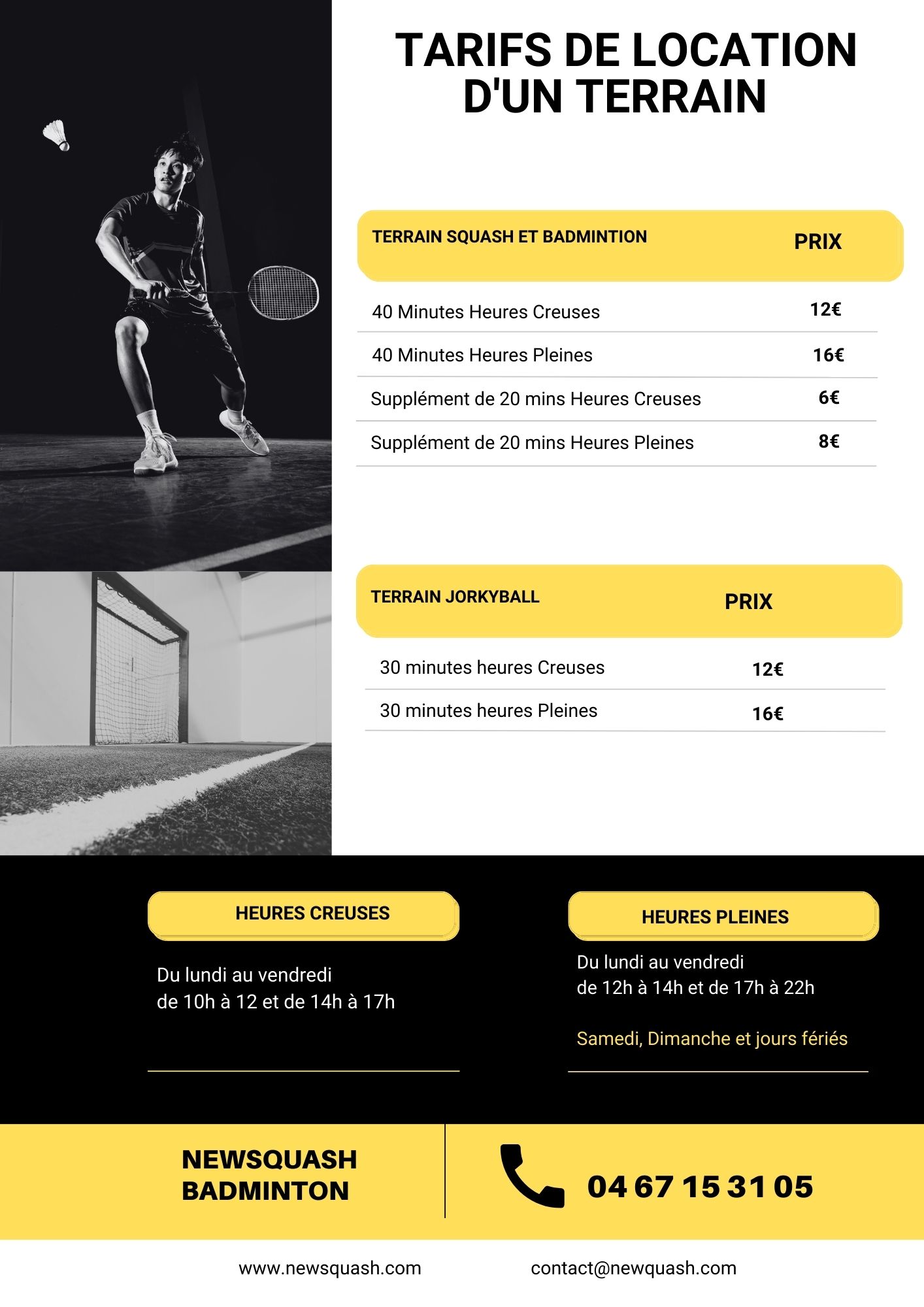 • Chaussures : 2 € (les semelles noires sont interdites au squash, les crampons ou assimilés sont interdits au jorkyball)